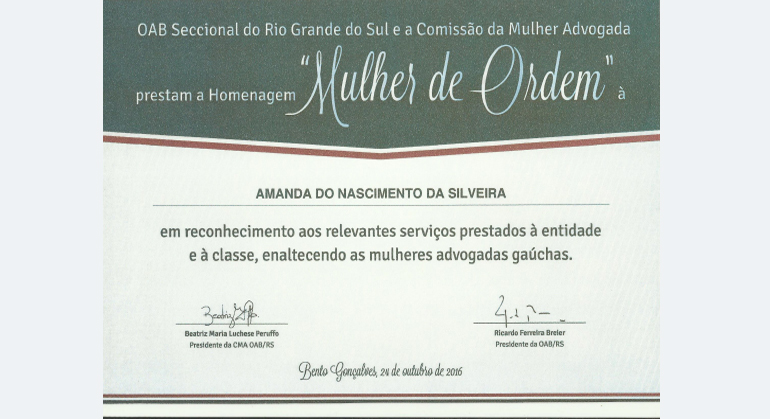 Homenagem Mulher de Ordem (2016) concedida pela OAB Seccional do RS e pela Comissão da Mulher Advogada da OAB/RS.
