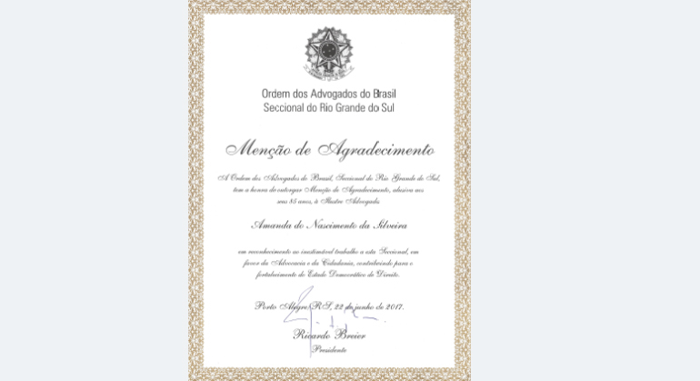 Voto de Louvor (2019) concedido pelo Conselho Federal da OAB/RS.