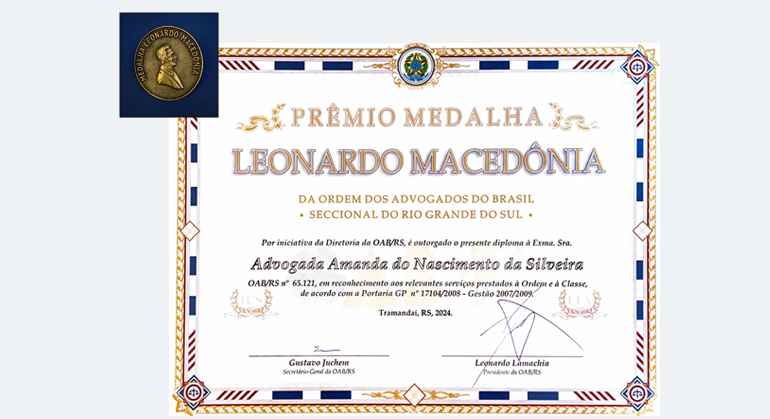 Medalha Leonardo Macedônia (2024) em reconhecimento pelos relevantes serviços prestados à Ordem e à Classe, concedida pela OAB Seccional do RS.