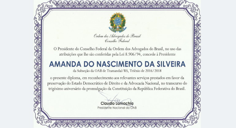Diploma de reconhecimento aos relevantes serviços prestados em favor da preservação do Estado democrático de Direito e da Advocacia Nacional (triênio 2016/2018).
